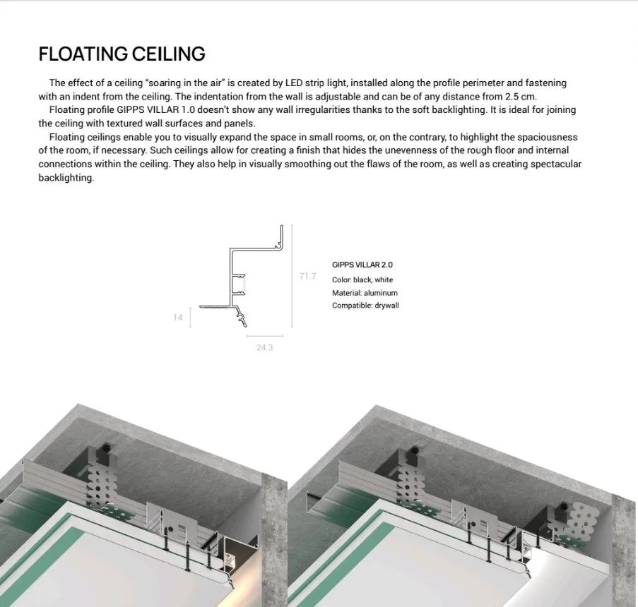 The profile is used to create the effect of a "floating in the air" drywall ceiling, with the ceiling attached with a gap from the walls. The attachment point of the structure is discreet, and soft light illuminates the ceiling perimeter.